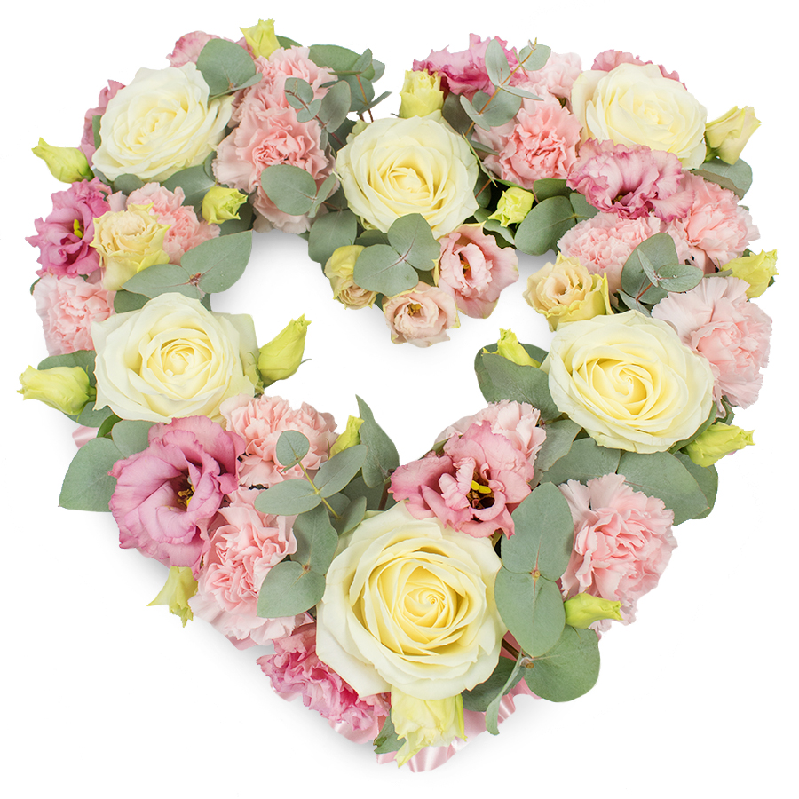 Celebrate beloved memories with our beautiful open heart tribute bouquet. This arrangement features a graceful combination of white roses, pink carnations, pink lisianthus, and eucalyptus leaves, all hand-selected to ensure vibrant colors and lasting freshness.
